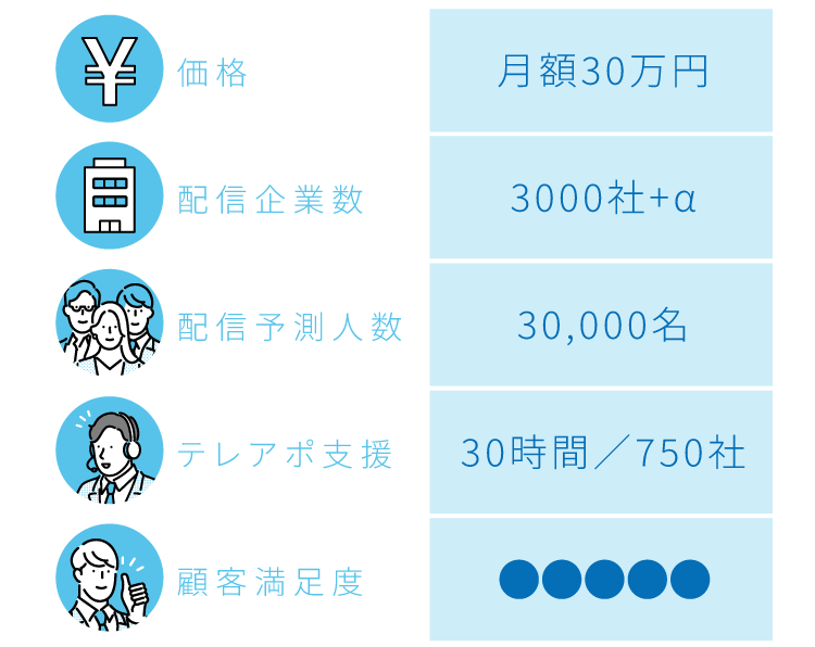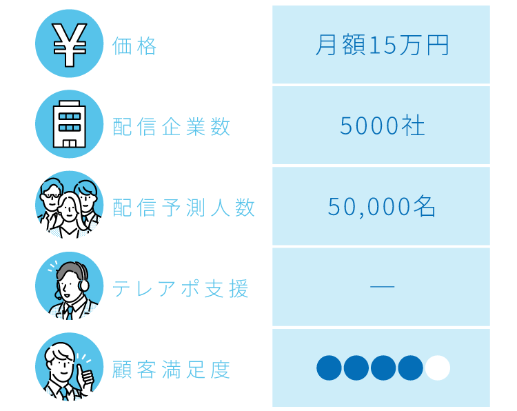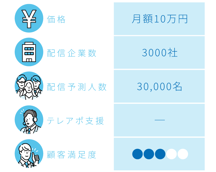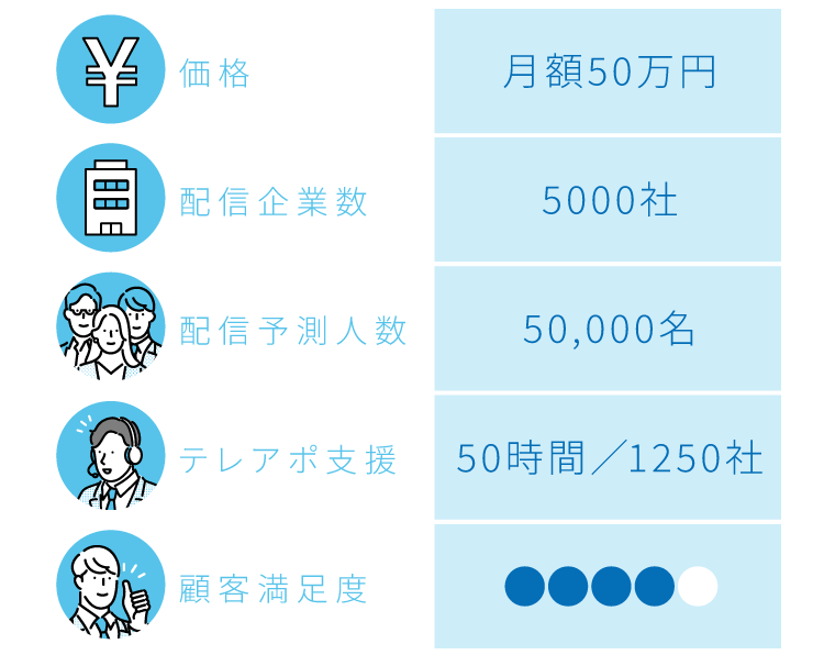 そんな中、狙いたい企業にアプローチできるリスクラ広告を活用したことで、少ない予算でも効率的に集客に繋げることができるようになりました。 また、送信件数や商材にもよりますが、1,000件で2~3件ほどコンバージョンが取れておりお客様も満足されています。